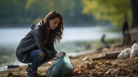 Volunteers clean up litter outdoors. Generative AI