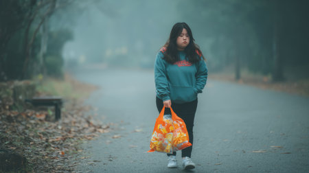 An overweight girl walking with a sad expression, holding a bag of chips in her hand.