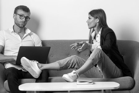 Coworkers couple on work break. Two creative workers discussing project in office. Coworkers talking. Business colleagues couple using laptop computer. Talking business people.
