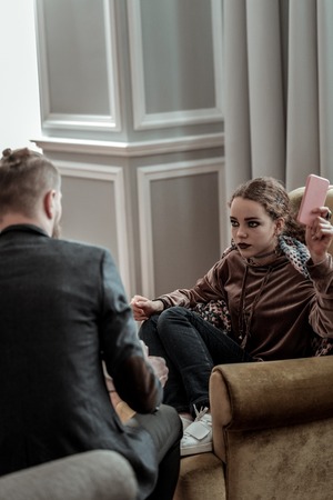 Depressed teenager. Professional counselor wearing dark jacket listening to depressed teenager