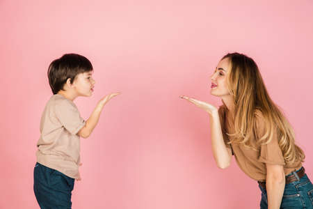 cute, beautiful children are standing in pink clothes on a pink background and the boy tells the girl secrets in her ear. Topics of friendship and relationships