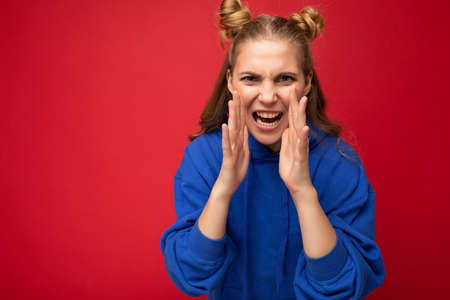 Photo of emotional angry young beautiful nice blonde female person with two horns with sincere emotions wearing trendy bright blue hoodie isolated over red background with empty space and yelling.