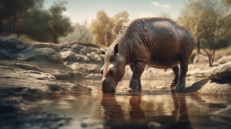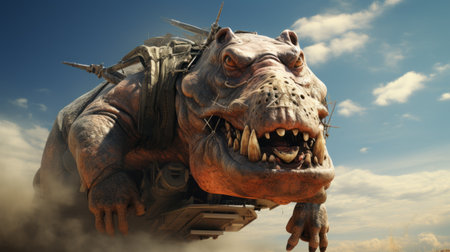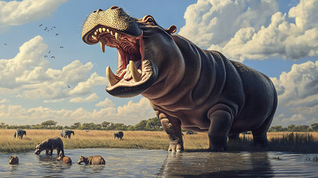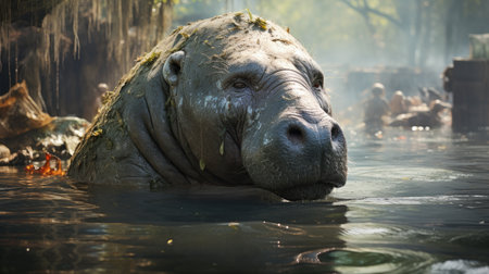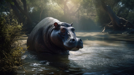 an enormous hippopotamus, inspired by the style of raphael lacoste, is depicted standing in a body of water. created using unreal engine 5, this artwork showcases naturalistic depictions of flora and fauna. the hippopotamus has a strong facial expression, achieved through the use of zbrush. this piece also draws inspiration from indonesian art, resulting in an eerily realistic portrayal. ai generated