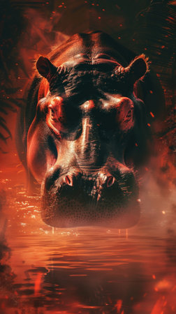 A stunning close-up portrait of a hippopotamus featuring its dramatic eyes and striking features contrasted against a dark, fiery background.
