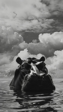 A black and white photo of a hippo in the water, AI