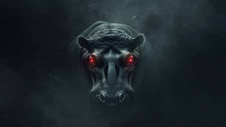A large hippopotamus emerges from a dark forest, walking towards the camera with intense eyes.