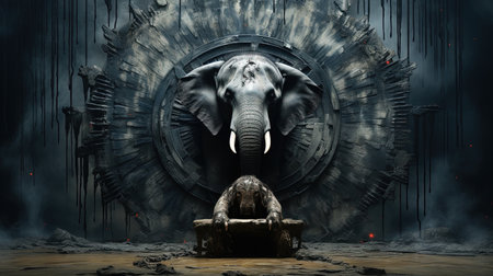 a majestic giant octopus, adorned in black leather clothing reminiscent of durk and gritty style, is captured in a creased, crinkled, and wrinkled portrait. the soft lighting enhances the strong facial expression of this caninecore-inspired image, taken with a nikon d850. the presence of majestic elephants adds to the overall grandeur of the scene. ai generated