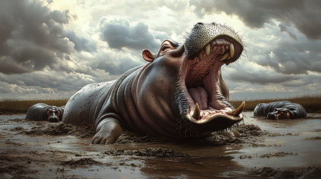 A powerful hippo yawns in a muddy wetland under a stormy sky showcasing nature's raw beauty.