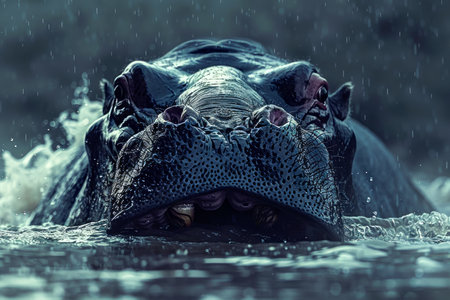 Majestic Hippopotamus Emerging From Water With Raindrops at Twilight, African Wildlife Scene AI Generative