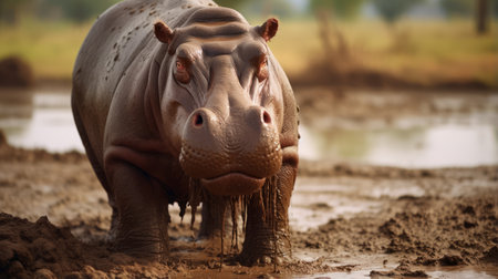a hippo covered in mud walks along a muddy river, showcasing detailed facial features. the hatecore style of the image highlights exacting precision and wet-on-wet blending techniques. the colors used, light crimson and light brown, add to the unpolished authenticity of the scene. the photo was taken with an iso of 200. ai generated