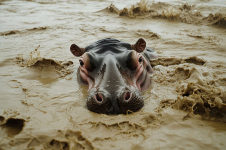 The image features a hippo in water, droplets spray the air. The hippos head emerges, showing its eyes and nostrils. The scene captures the hippopotamus natural habitat and behavior.