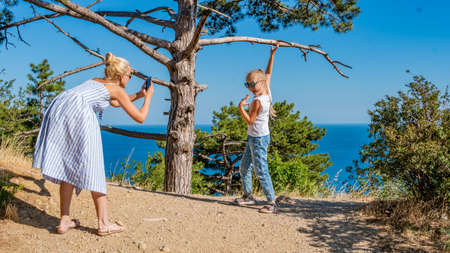 Take a mobile picture on your phone seashore. Female hands hold the phone and take pictures. Travel photography.