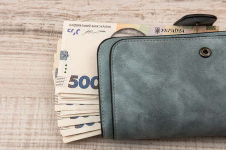Ukrainian currency. Five hundred hryvnia banknotes on wooden desk