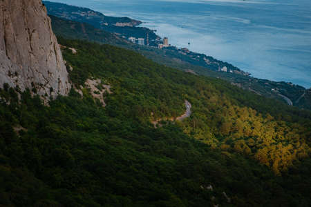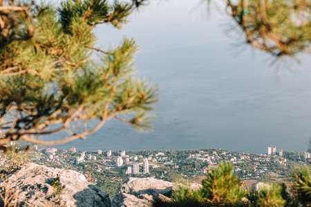 Picturesque view of the city of Yalta and the Black Sea from Ai Petri mountain in the Crimea.