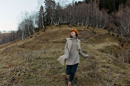 Pretty girl tourist in casual clothes walking on a mountain hike against the backdrop of the lake, looking away with a serious face.Woman tourist stands on a hill in lobby of the Ukrainian landscape