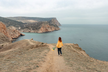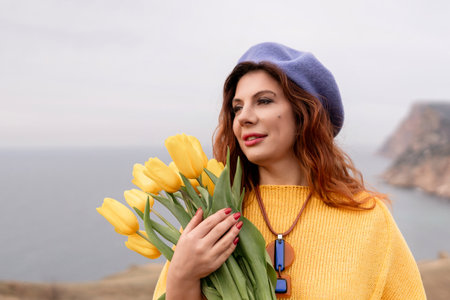 Portrait of a happy woman with hair flying in the wind against the backdrop of mountains and sea. Holding a bouquet of yellow tulips in her hands, wearing a yellow sweater