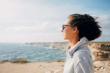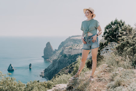 Beautiful young woman standing on a cliff of a mountain over the sea.