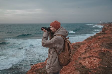 A woman take a photo of the sea on smartphone, female travels along the coast in the cold season. Outdoor. POV. Close up