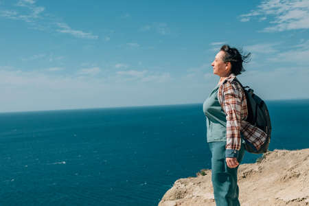 an adult woman with a backpack and in a plaid shirt went hiking in the mountains near the ocean on a spring sunny day, a pensioner admires the sea in good weather. high quality photo