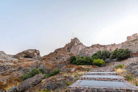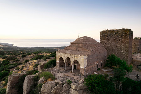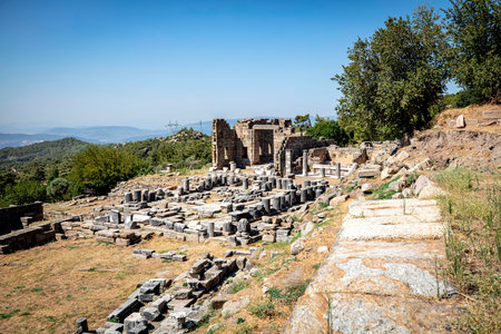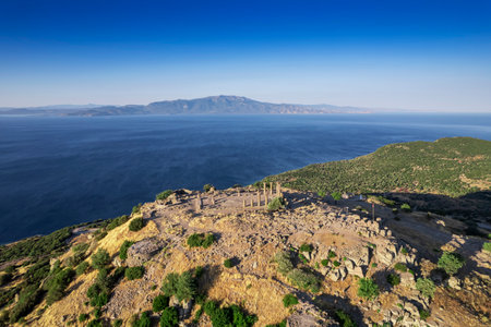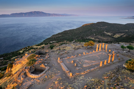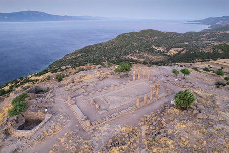 Temple of Athena in Assos ancient city ruins. Visit Turkiye concept photo. Canakkale Turkiye - 4.13.2024