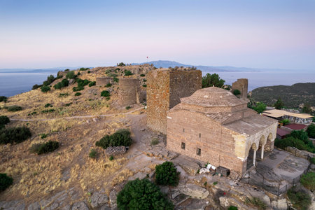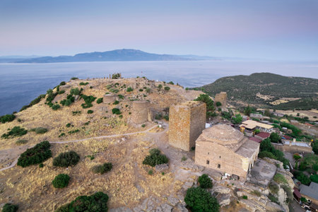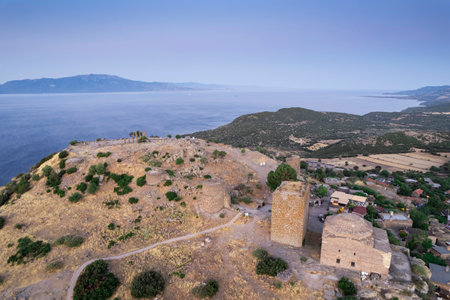 The ruins of the Temple of Athena in the ancient city of Assos. Panoramic view of Canakkale, Türkiye