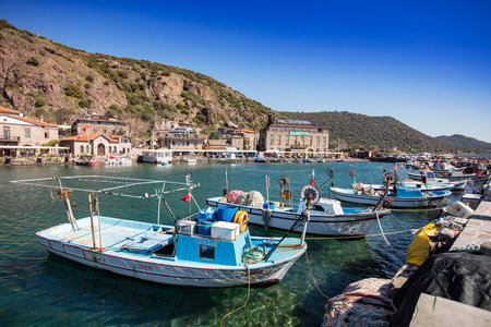 IZMIR, TURKEY - JUNE 05, 2019 : Fishing boats in touristic place of Aegean Region in Phocaea Town with old and historical, traditional architecture buildings. Phocaea is ancient city in old dates.
