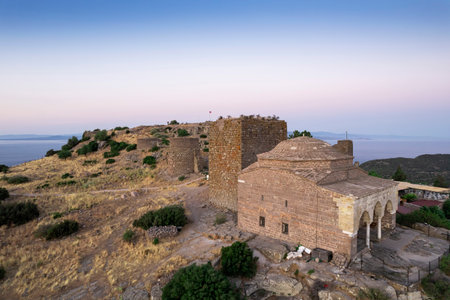 Sunset view from Byzantine Medieval Castle of Myrina in Lemnos or Limnos Greek island northern Aegean Sea.