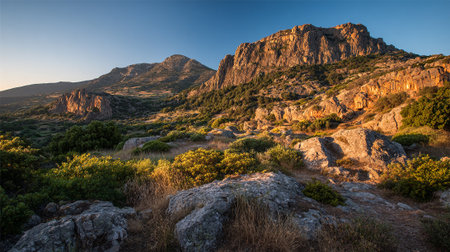 Scenic Mountain Landscape Bathed in Warm Sunlight Under a Clear Blue Sky
