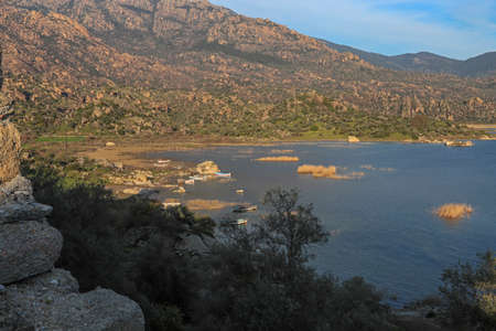 The photo was taken at Bafa Lake in Turkey. White sands and mountain background also have green plants.