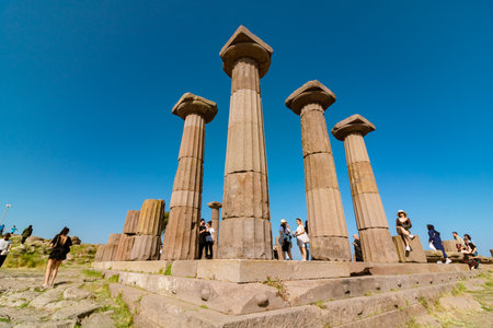 Ruins of Temple of Athena with tourists in Assos ancient city. Canakkale Turkiye - 4.13.2024