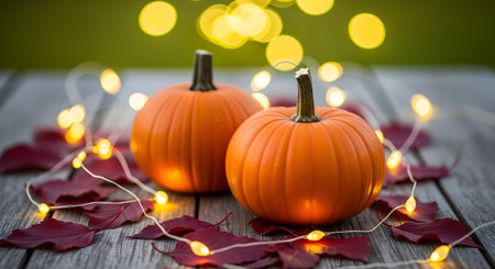 Two bright orange pumpkins sit on a rustic wooden surface, surrounded by deep red autumn leaves and a string of warm, glowing fairy lights. The lights create a soft bokeh effect in the background, evoking a cozy and festive autumn atmosphere.