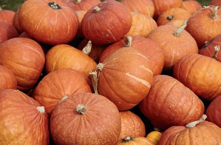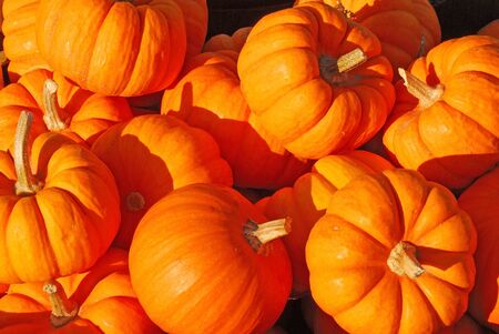 A full frame food background image of a stack of orange pumpkins for sale on a market stall for Halloween or pumpkin pie