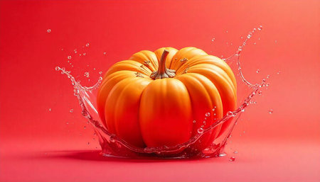 Banner. An orange pumpkin on a porcelain podium. Orange background with a shadow from a monstera leaf. With space to copy. High quality photo