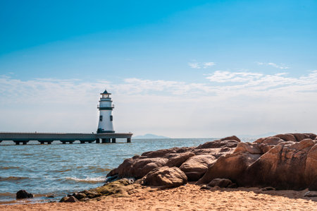 Lighthouse on the beach with blue sky and sea background.