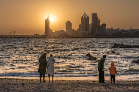 QINGDAO, CHINA - NOVEMBER 14: This is a scenic view of a beach with people watching the sunset on November 14, 2019 in Qingdao