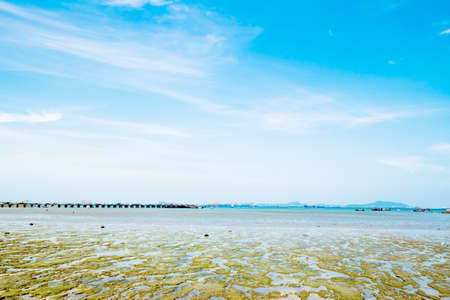 Ebb tide at sea of Kho Loi island in Sriracha Thailand has stone and green mud appear.