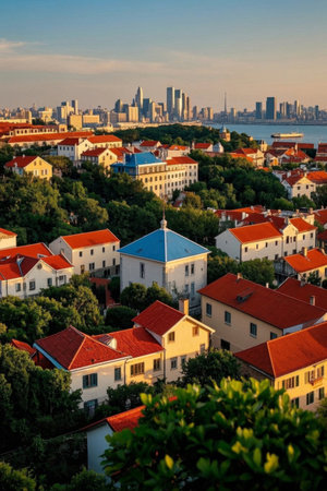 Qingdao cityscape and red roofed architectural landscape
