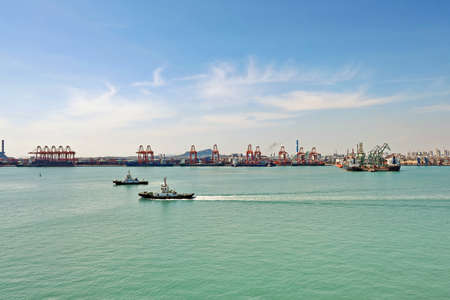 Panoramic views of piers, sea vessels, tugboats and the city of Rizhao, China.