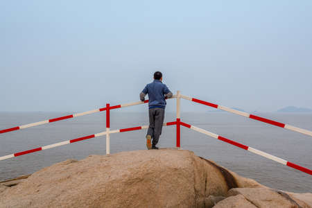 A Chinese male tourist standing on rocks and looking at the sea in Putuoshan, Zhoushan Islands, a renowned site in Chinese bodhimanda of the bodhisattva Avalokitesvara (Guanyin)