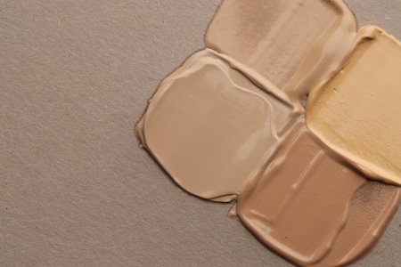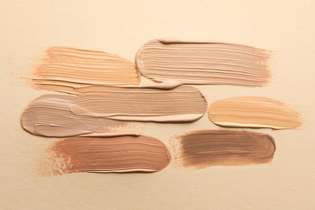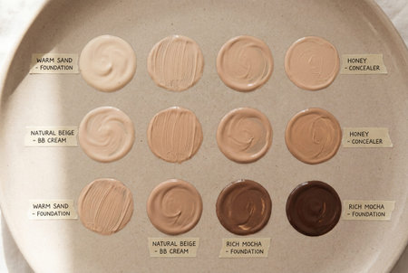 Arrangement of twelve cosmetic texture swatches in various shades of foundation BB cream and matte concealer displaying application variations for makeup product selection and color matching