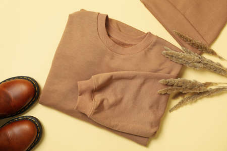a handsome, pleasant, smiling young man in a long beige sweater stands against a plain background and holds his sleeves. Horizontal studio photo with empty space eod advertising text