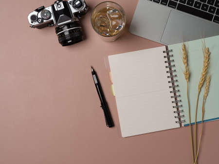 Top view of workspace with opened notebook, pen, laptop, camera and copy space on pink table