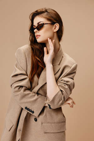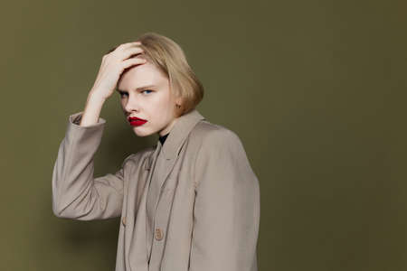 pretty woman in beige coat gesturing with hands and makeup on face hairstyle model