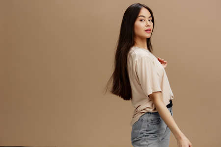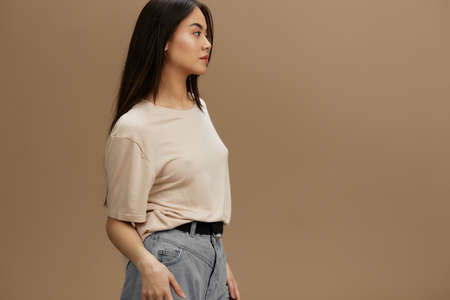 pretty woman in a beige T-shirt posing clothing fashion studio model