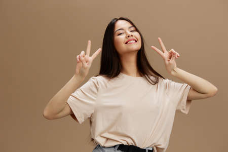 portrait woman in a beige T-shirt posing clothing fashion isolated background