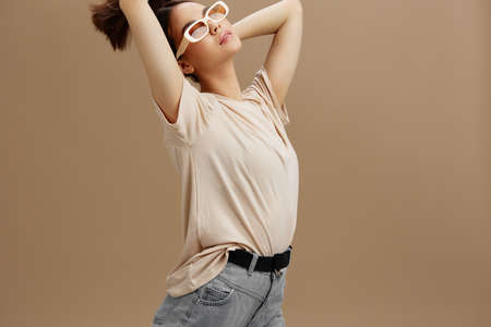 pretty woman in sunglasses t-shirt posing modern styles beige background