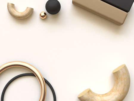Beautiful womans small beige leather lifestyle bag with black sunglasses, comb and plastic cream box on yellow gold luxury background. Minimal fashion design. Copy space.