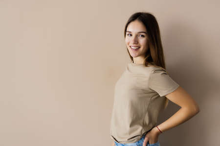 Pretty smiling woman with long straight brown hair posing isolated on beige background