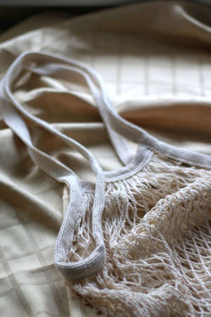 Reusable mesh tote bag on beige textile background. Selective focus.