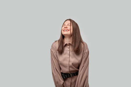 Laughing brunette girl with a wide smile. Human sincere emotions. Gray background.